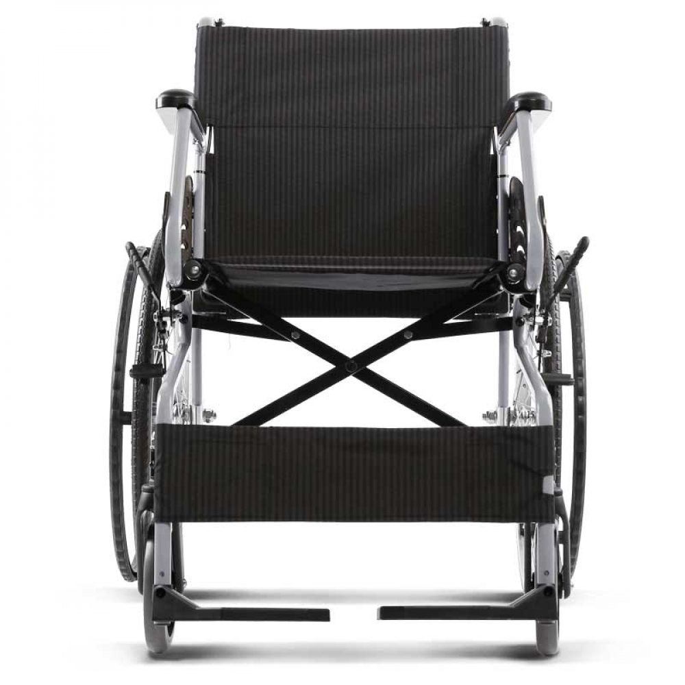 كرسي متحرك خفيف الوزن مصنوع من سبائك الألومنيوم مع عجلات كبيرة ذاتية الدفع. مثالي لشخص يتمتع ببعض القوة في الجزء العلوي من الجسم.